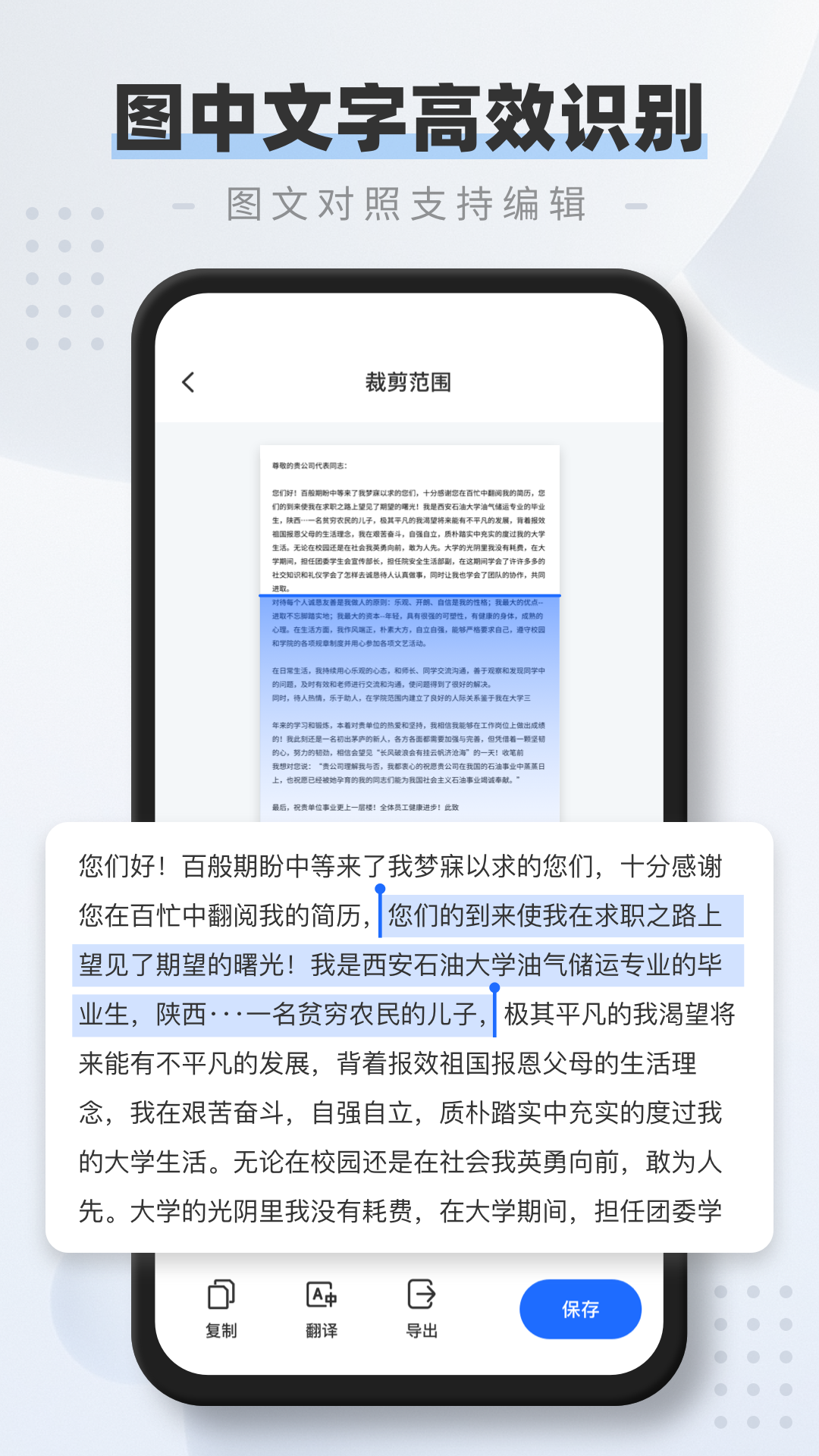 精準(zhǔn)識(shí)別,準(zhǔn)確識(shí)別率高達(dá)99.9%,一鍵拍照即可快速識(shí)別出圖片中的文字,操作簡單直觀