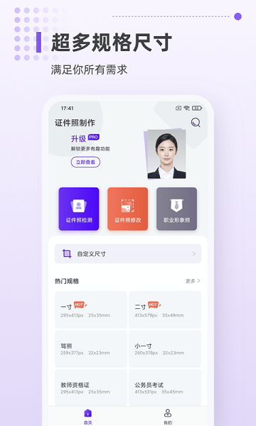 一寸證件照相機(jī),一鍵換底色,智能摳圖換正裝。幫助你足不出戶,就能擁有自己的證件照。內(nèi)含多種尺寸,滿足所有的證件照需求。
