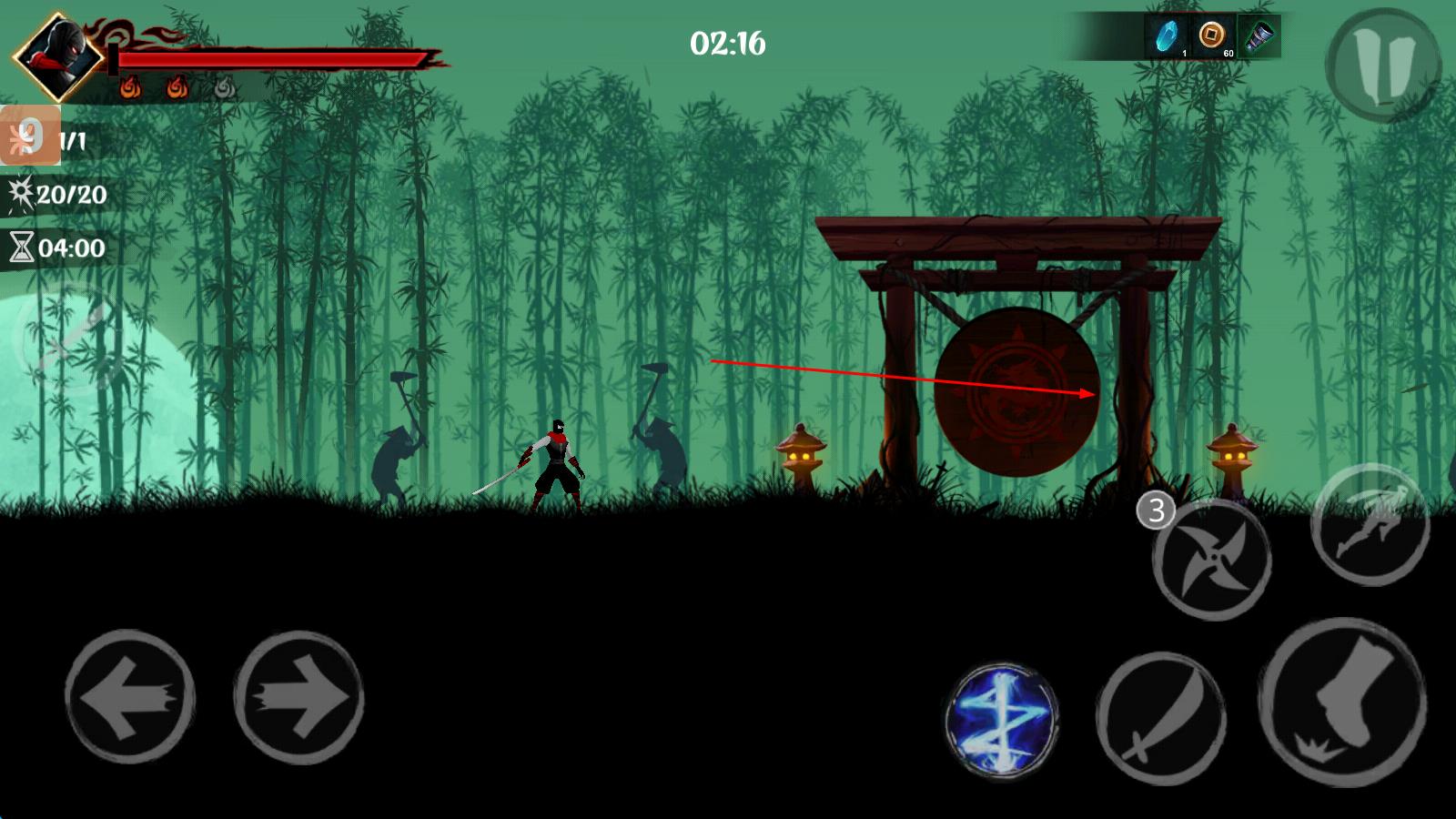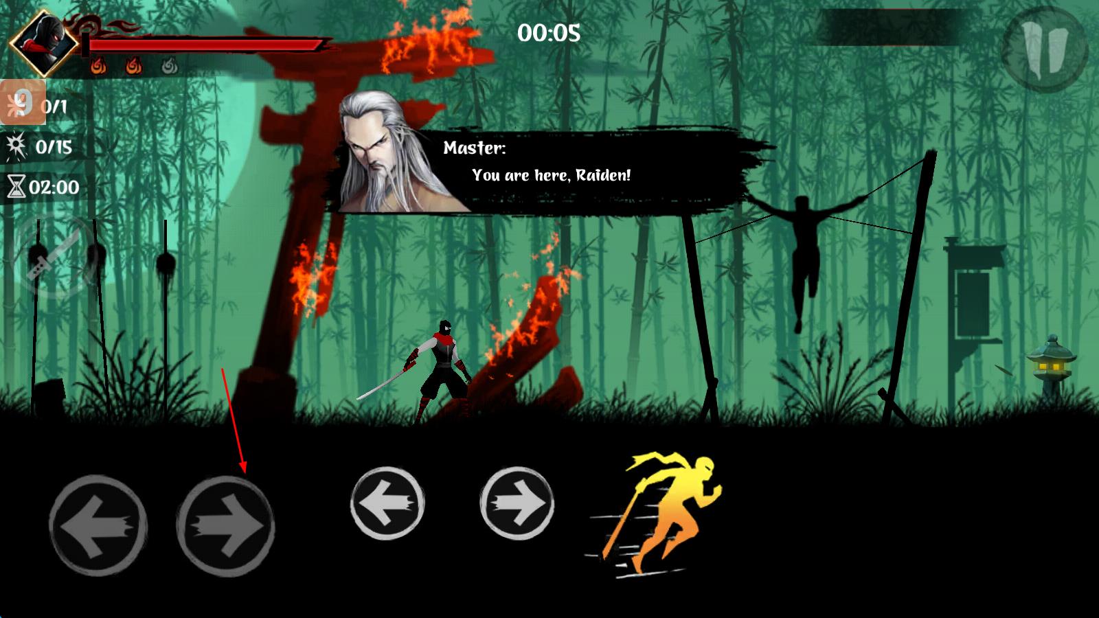 1、操控忍者武士移動,利用左右方向鍵調(diào)整位置,接近敵人或目標(biāo)區(qū)域,留意場景障礙與敵人動向,按沖刺鍵可快速突進(jìn),靈活走位應(yīng)對挑戰(zhàn)。