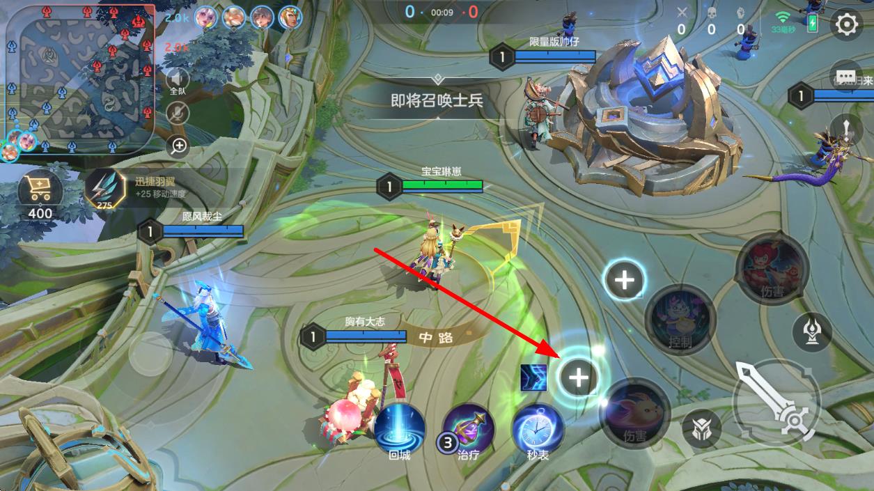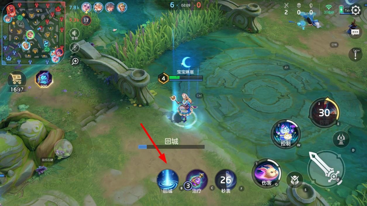 2、游戲進行中,當需要回復狀態(tài)時,點擊屏幕下方的回城按鈕,英雄就會返回泉水恢復生命值和法力值。