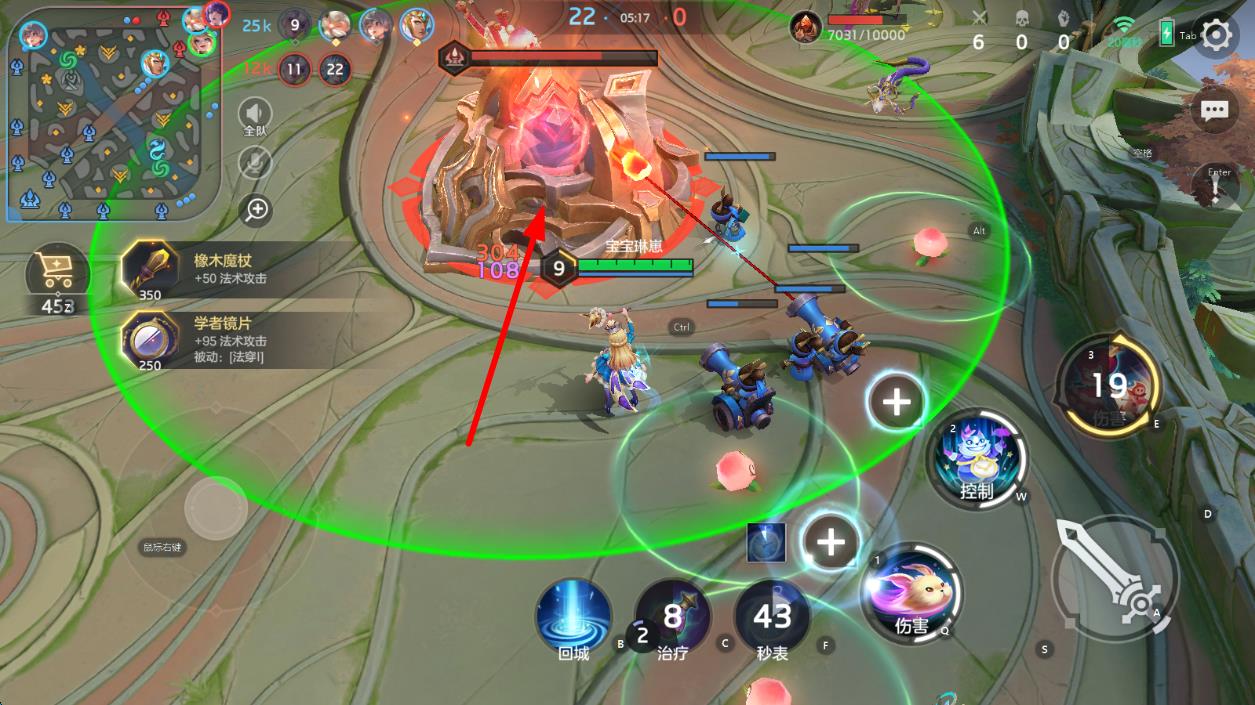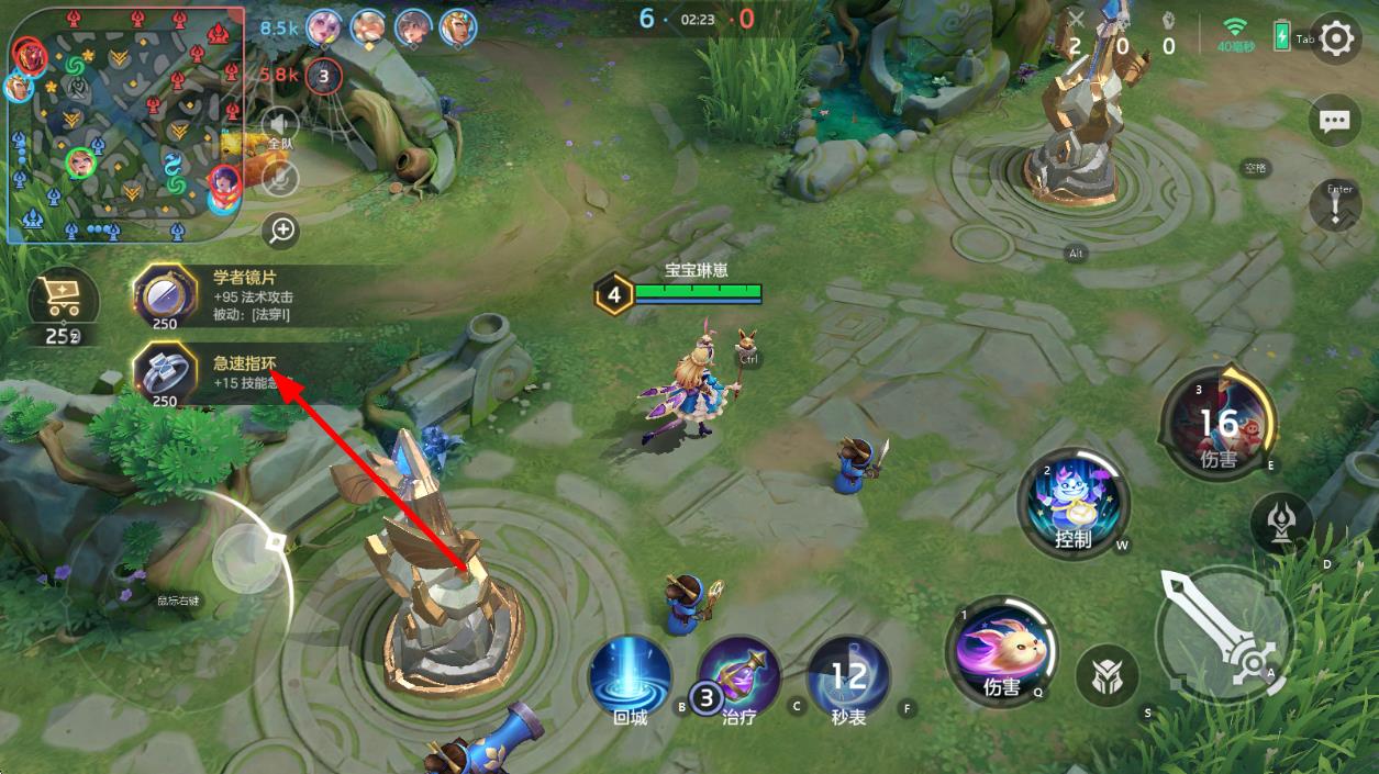 3、積累足夠金幣后,再次點擊按鈕打開商店,根據(jù)英雄定位和局勢選擇合適裝備,關(guān)注小地圖上隊友和敵人的位置,配合隊友進行游走、抓人等操作。