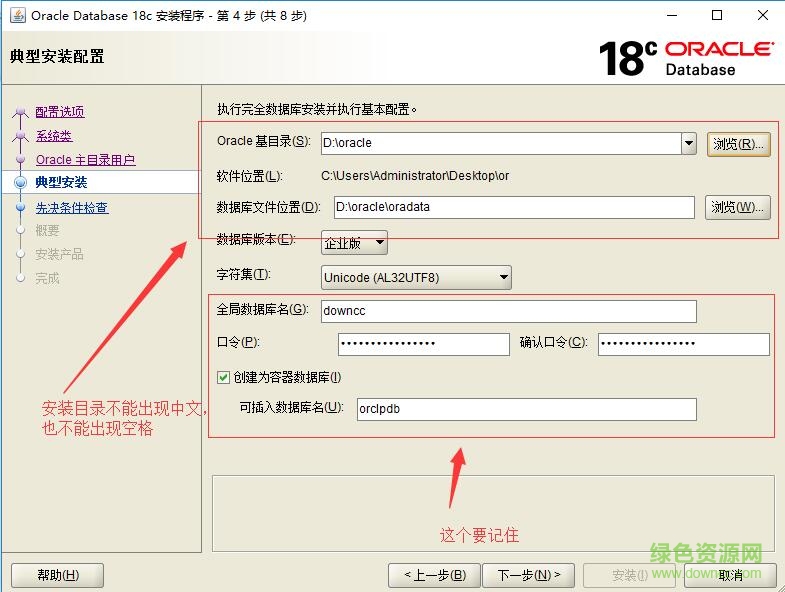 5.選擇好安裝目錄,安裝目錄別輸入中文和空格,這個數據庫口令也要記住,建議這個口令設置的前面口令一樣,方便記住,也不擔心搞混,用戶名和全局數據庫名也一樣,免得搞混