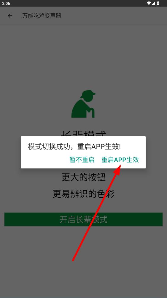 4、彈出模式切換成功提示框,點(diǎn)擊重啟APP生效,重啟APP后老人模式即可生效。