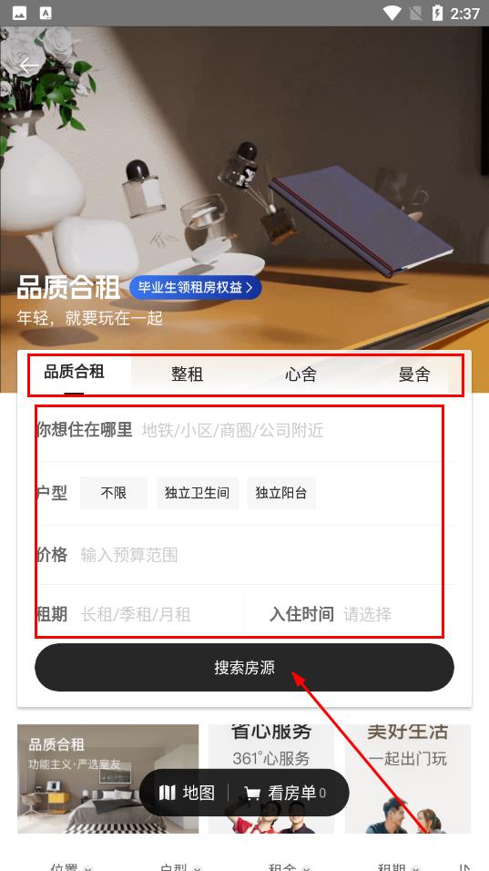 2、根據需求,設置位置、戶型、價格、租期、入住時間等篩選條件,點擊搜索房源。