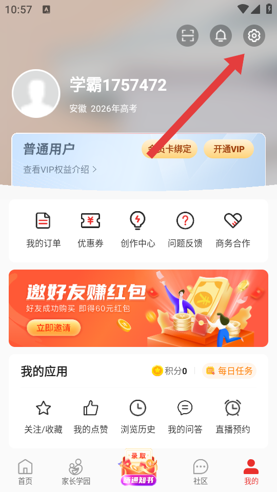1、在優(yōu)志愿我的頁面,點擊右上角的設(shè)置圖標(biāo),進入系統(tǒng)設(shè)置界面。