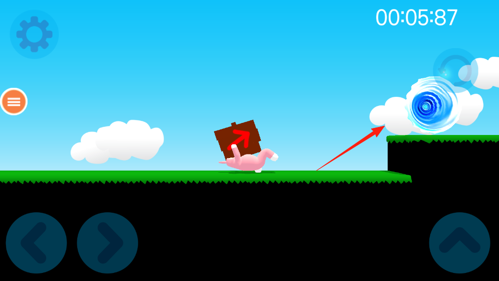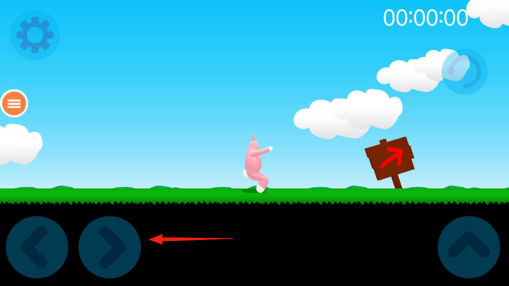 1、進(jìn)入超級兔子人游戲,選擇粉色兔子角色,在草地場景中通過方向控制按鈕左右移動(dòng),遇到障礙時(shí)點(diǎn)擊向上箭頭按鈕跳躍,借助箭頭指示牌指引前進(jìn)方向。