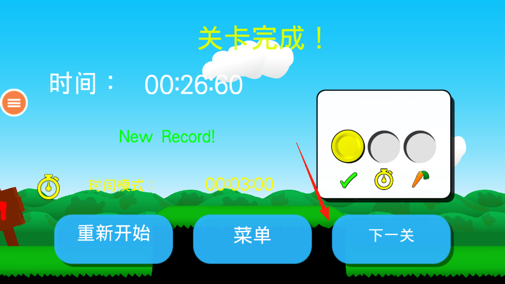 3、關(guān)卡結(jié)束后,可根據(jù)需求點(diǎn)擊重新開始按鈕再次挑戰(zhàn),或選擇菜單按鈕返回主界面,也能點(diǎn)擊下一關(guān)按鈕進(jìn)入新關(guān)卡,界面還顯示金幣計(jì)時(shí)胡蘿卜等評價(jià)圖標(biāo)。