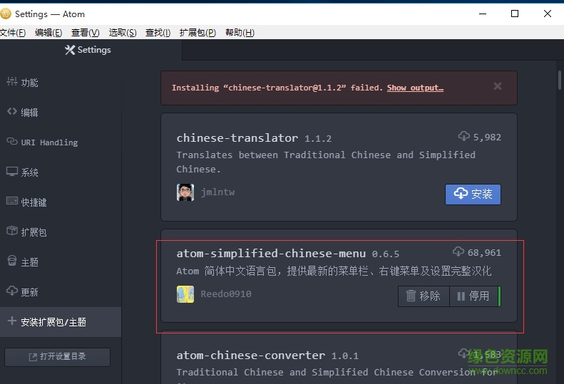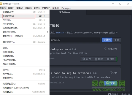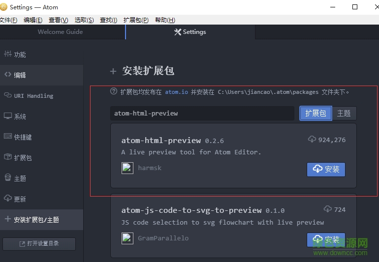 1.選擇擴(kuò)展包,安裝atom-html-preview擴(kuò)展包