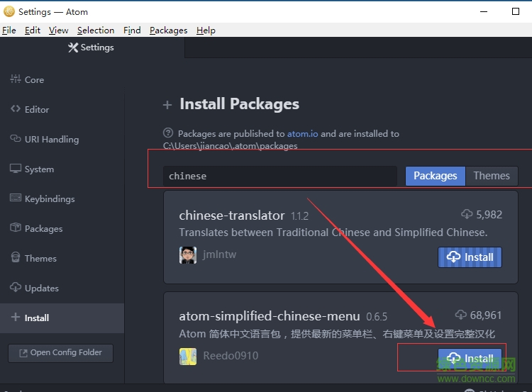3.輸入框輸入chinese,在點(diǎn)擊packages,選擇第二個(gè)安裝點(diǎn)擊install開始安裝