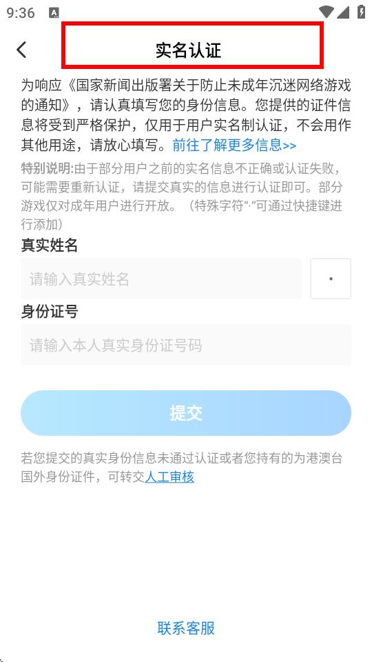 3、進入實名認證頁面后,按要求輸入真實姓名及本人真實身份證號碼,點擊提交完成實名認證。