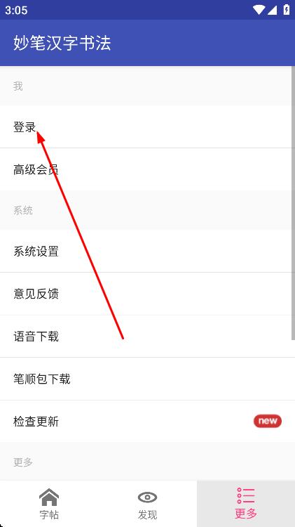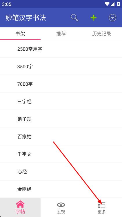 1、打開(kāi)妙筆漢字書(shū)法,點(diǎn)擊底部導(dǎo)航欄中的更多。