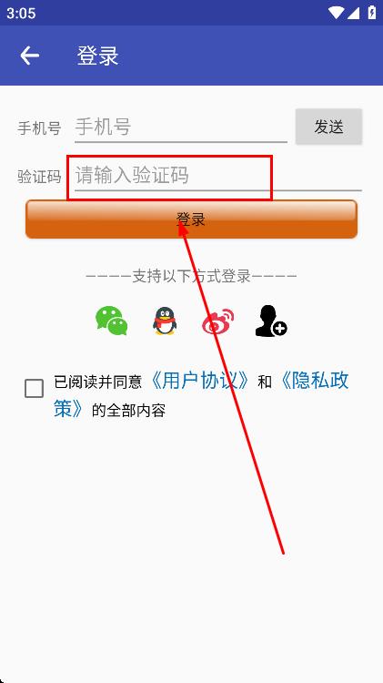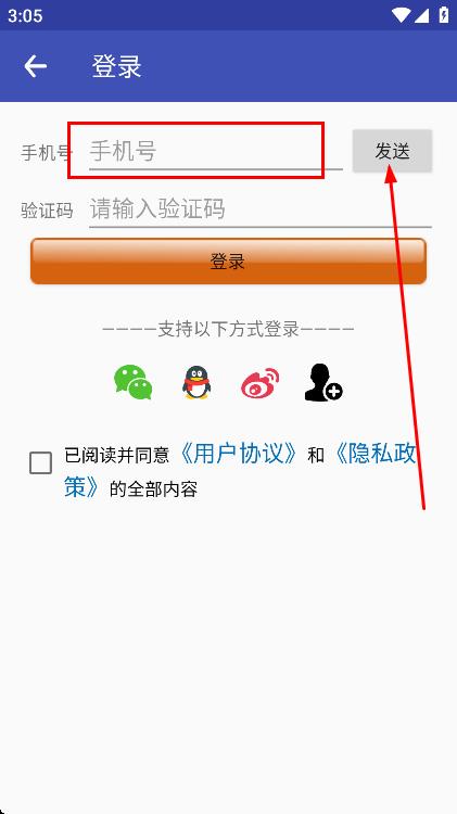 3、輸入需要登錄的手機(jī)號(hào),點(diǎn)擊發(fā)送按鈕獲取驗(yàn)證碼。