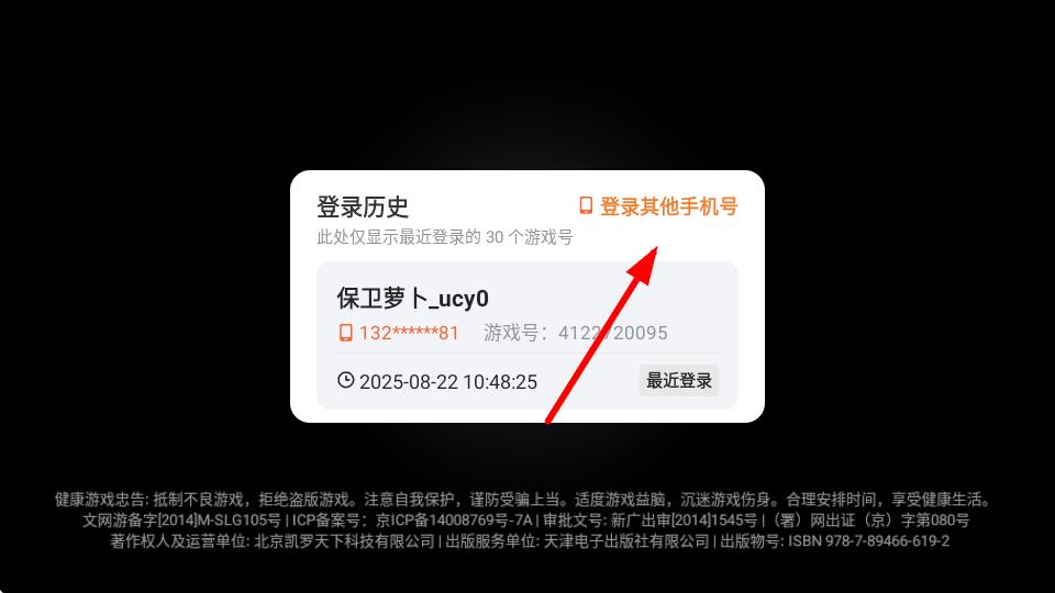 1、打開(kāi)保衛(wèi)蘿卜游戲,在出現(xiàn)的界面中看到登錄歷史彈窗,若有你想登錄的賬號(hào)可直接點(diǎn)擊最近登錄,若沒(méi)有則點(diǎn)擊登錄其他手機(jī)號(hào)。