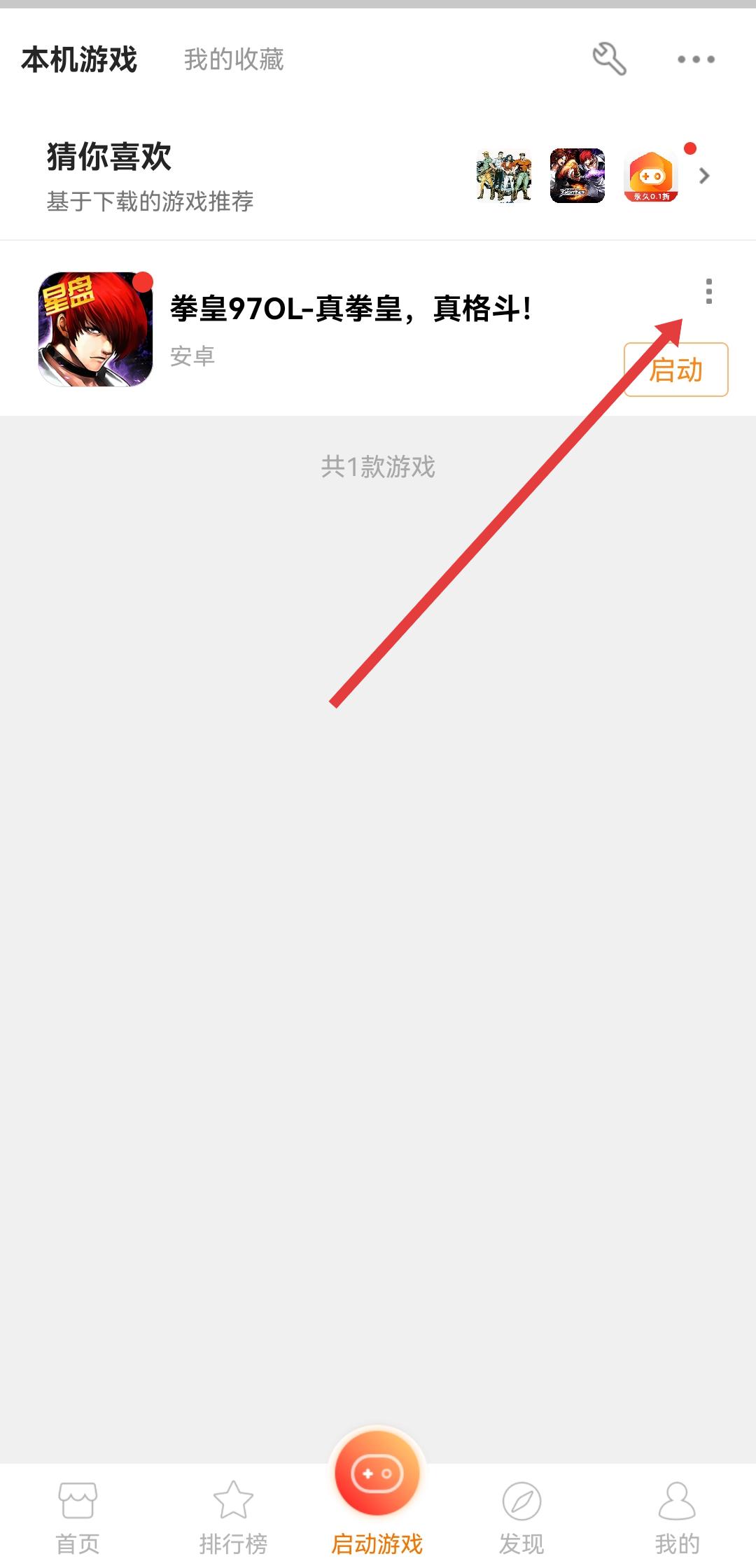 1、進(jìn)入悟飯游戲廳啟動(dòng)游戲頁(yè)面后,找到要?jiǎng)h除安裝包的游戲,點(diǎn)擊游戲右側(cè)的豎向三點(diǎn)按鈕。