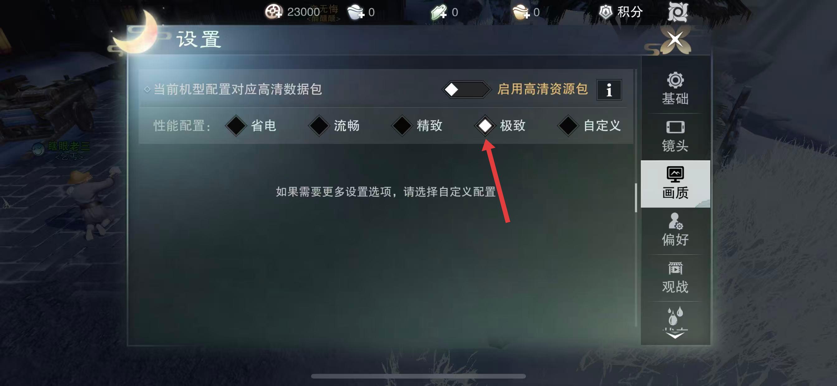 3、找到性能配置選項(xiàng),想要更清晰的畫(huà)質(zhì),可以選擇極致模式。