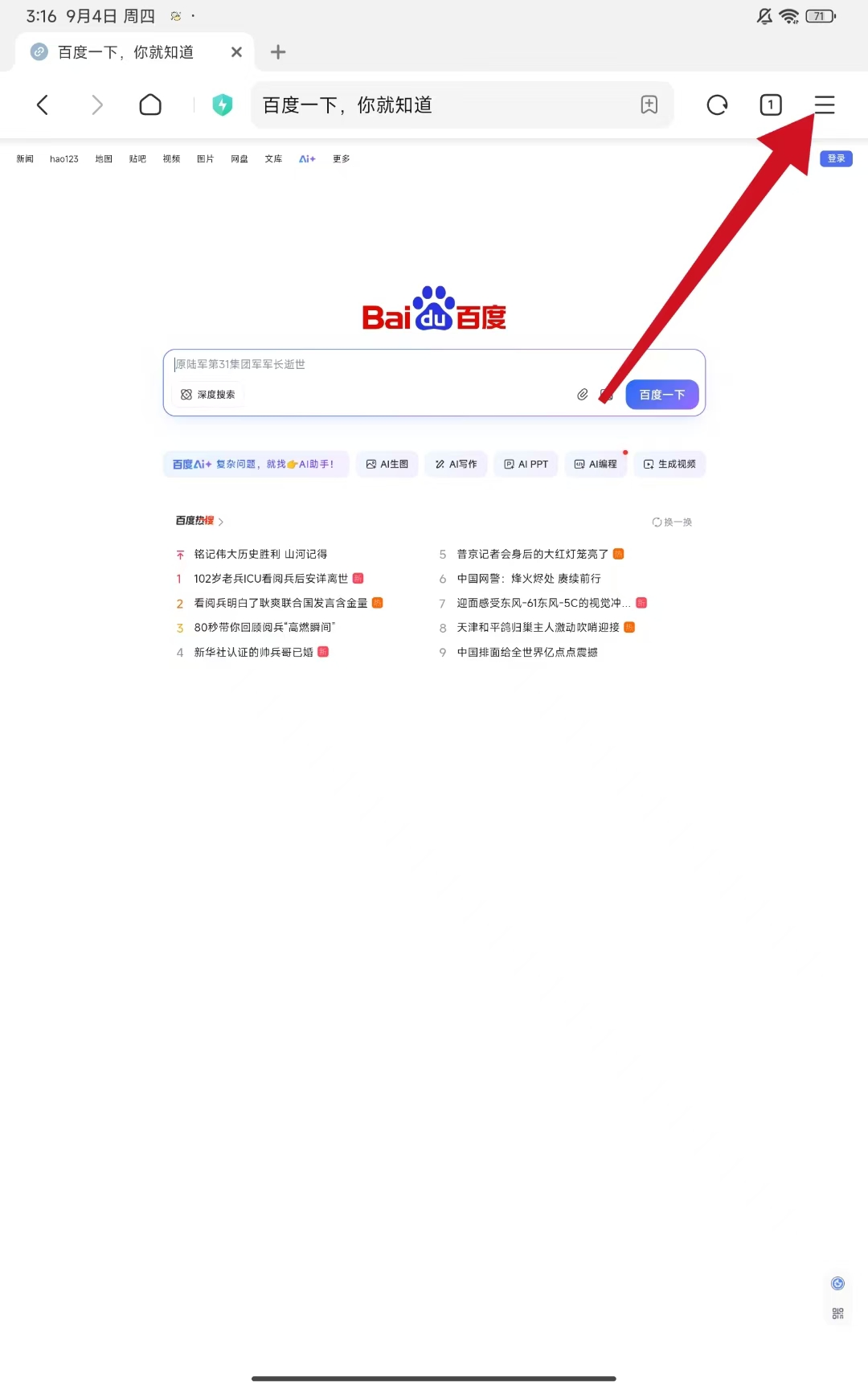 1、打開小米瀏覽器,點擊界面右上角的三條橫線菜單圖標,會彈出包含多種功能選項的菜單。