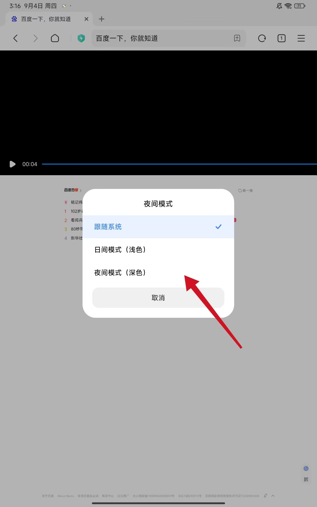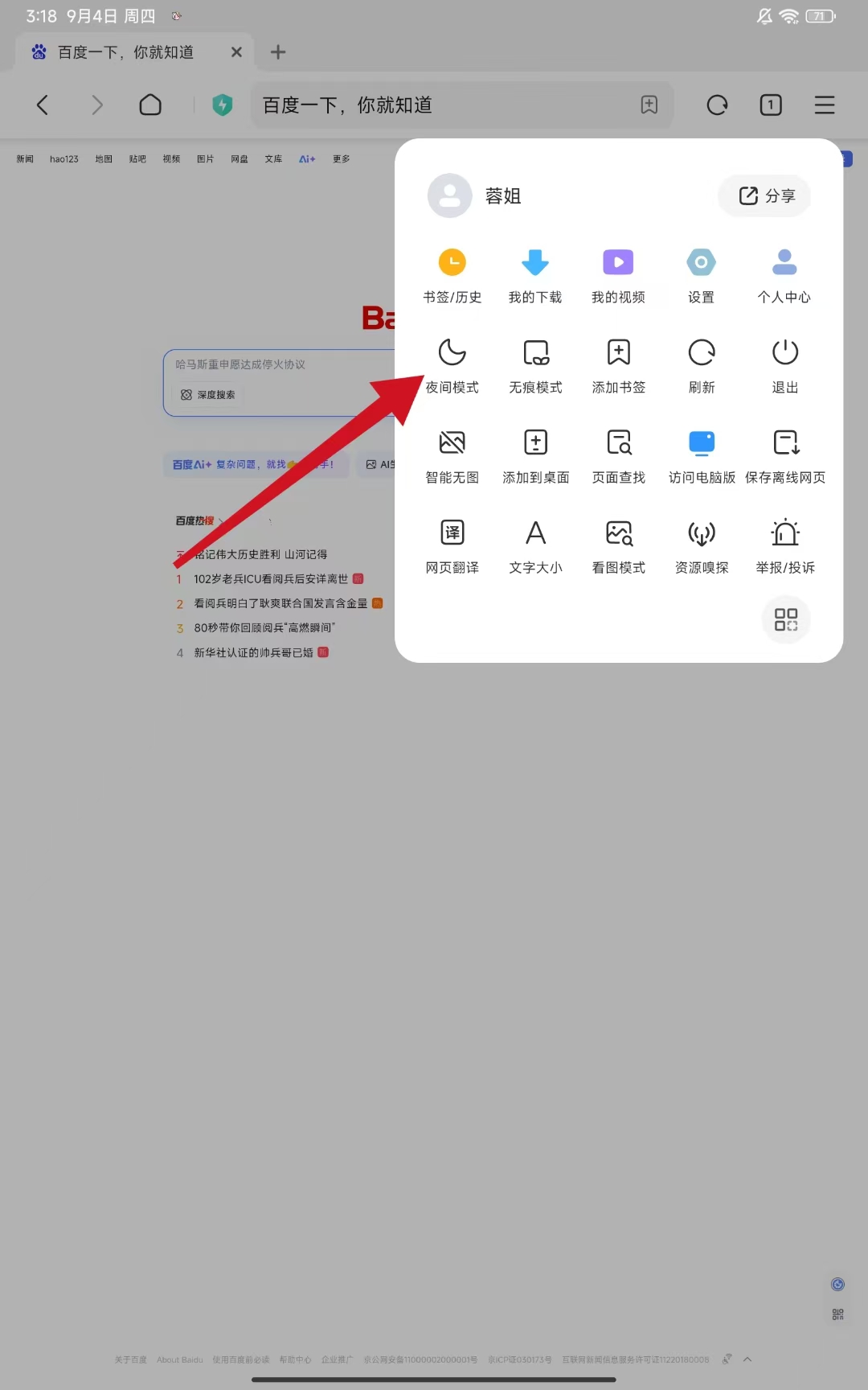 2、在彈出的菜單中找到夜間模式選項并點擊選項。