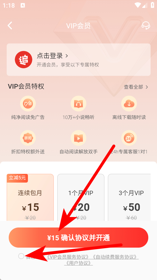 4、勾選同意相關協(xié)議后,點擊確認協(xié)議并開通,開通VIP后即可下載小說。