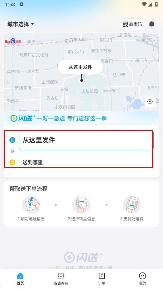1、打開閃送APP,在從這里發(fā)件”和“送到哪里輸入框中,分別填寫寄件地址和收件地址。