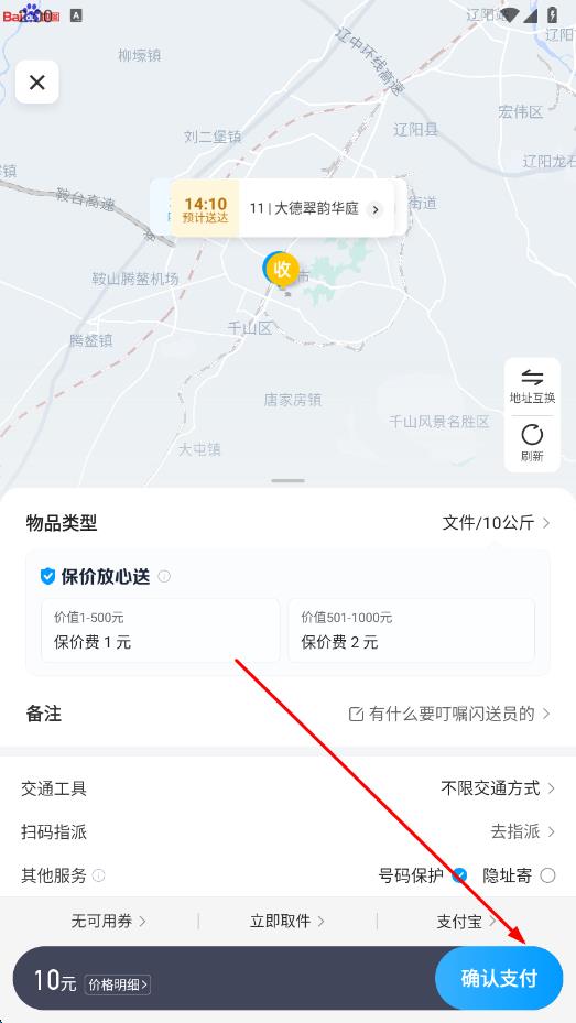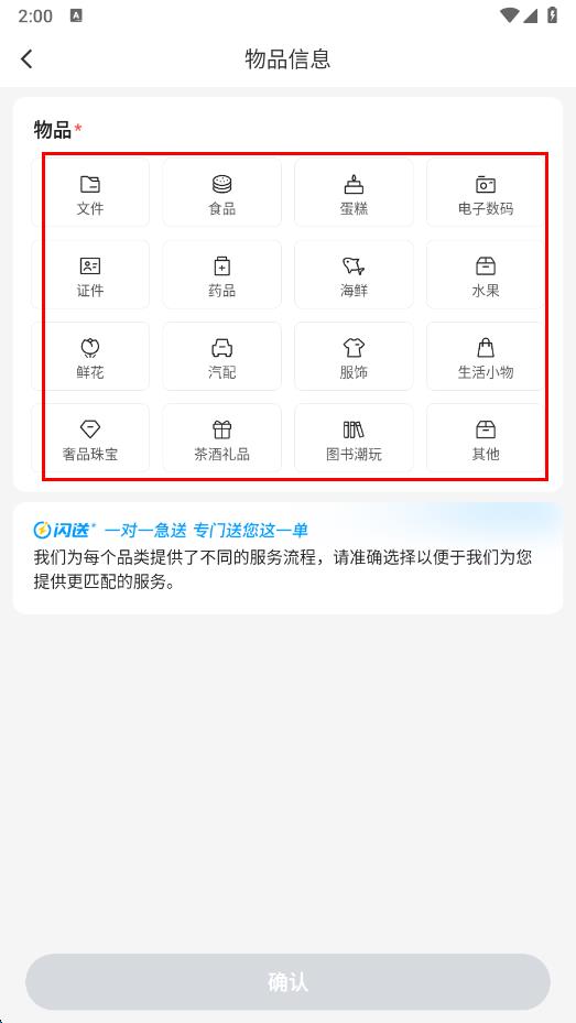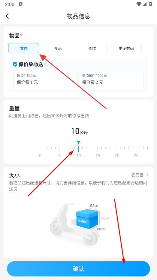 3、選擇物品類型后,根據(jù)實(shí)際情況選擇是否保價(jià),設(shè)置物品重量,點(diǎn)擊確認(rèn)。