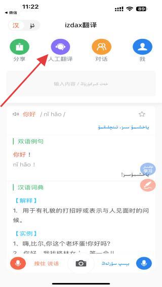 1、打開(kāi)izdax漢維翻譯應(yīng)用軟件,進(jìn)入到首頁(yè)內(nèi)點(diǎn)擊人工翻譯的按鈕。