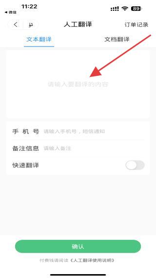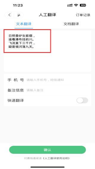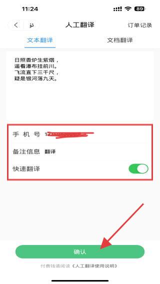 4、輸入文本內(nèi)容后,再填寫(xiě)手機(jī)號(hào)、備注信息,最后點(diǎn)擊確認(rèn)的按鈕即可開(kāi)始翻譯。