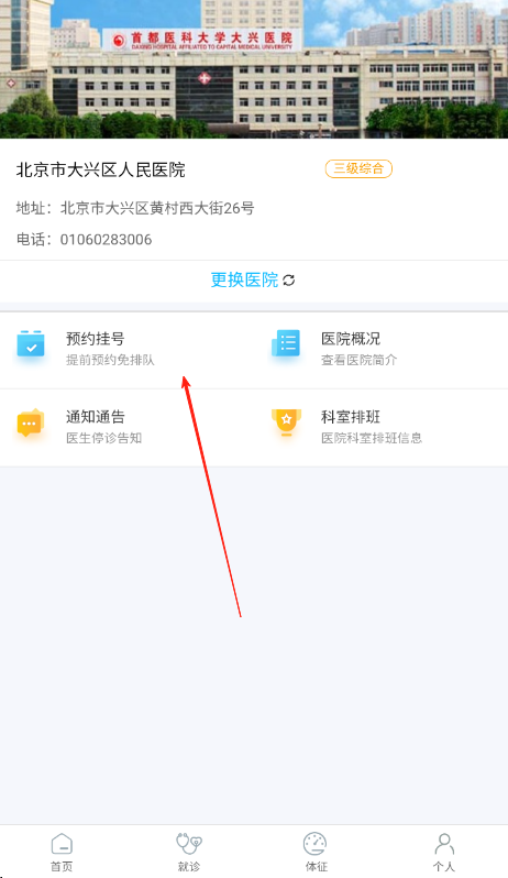 2、切換到底部導(dǎo)航就診頁面,選定北京市大興區(qū)人民醫(yī)院后,點擊預(yù)約掛號功能,依據(jù)指引確認就診信息,提交預(yù)約申請,還可查看醫(yī)院概況了解機構(gòu)詳情。