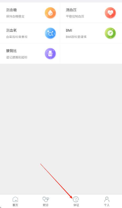 3、進入體征頁面,按需選擇測血糖測血壓等檢測功能,按照APP提示準備檢測工具,規(guī)范操作采集數(shù)據(jù),完成后可查看檢測結(jié)果,輔助健康管理。