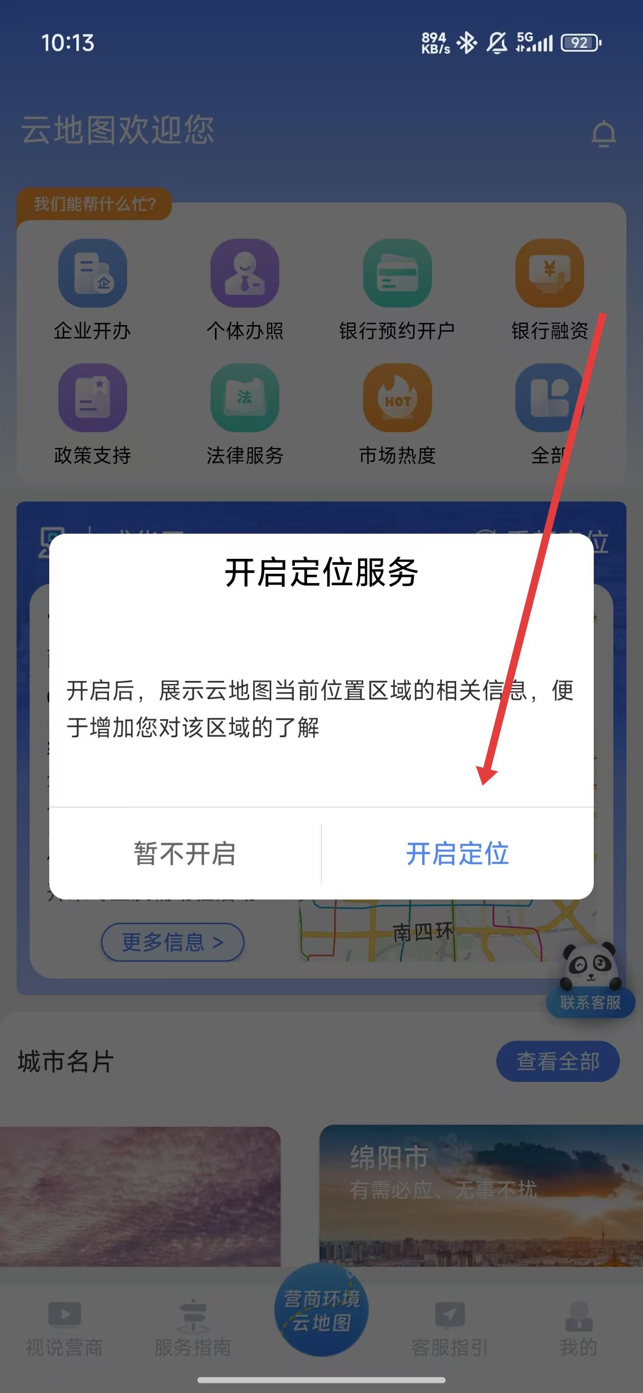 2、在進入到app首頁后,點擊彈窗中的開啟定位按鈕,開啟定位服務(wù)。