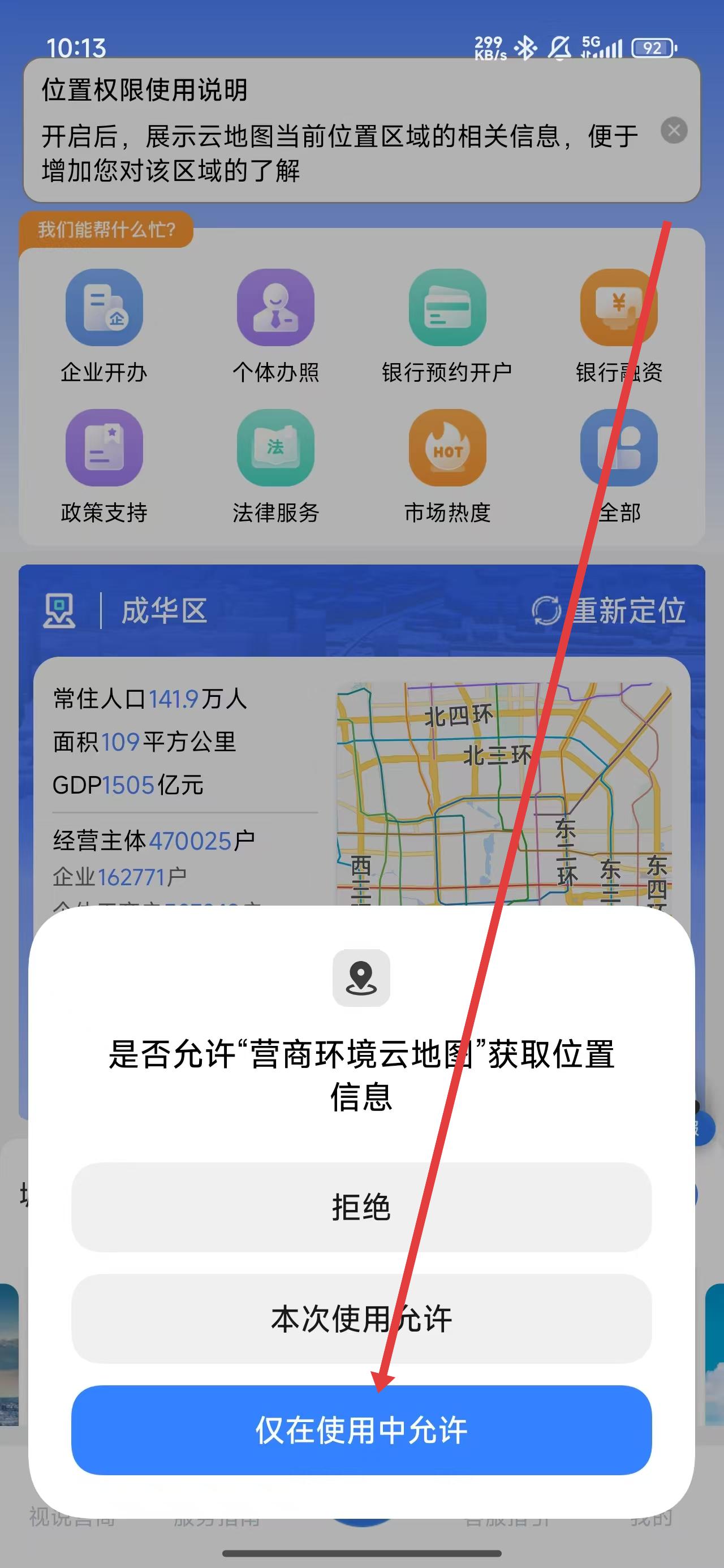 3、可以點擊僅在使用中允許按鈕,使app獲取到位置信息完成開啟定位操作。