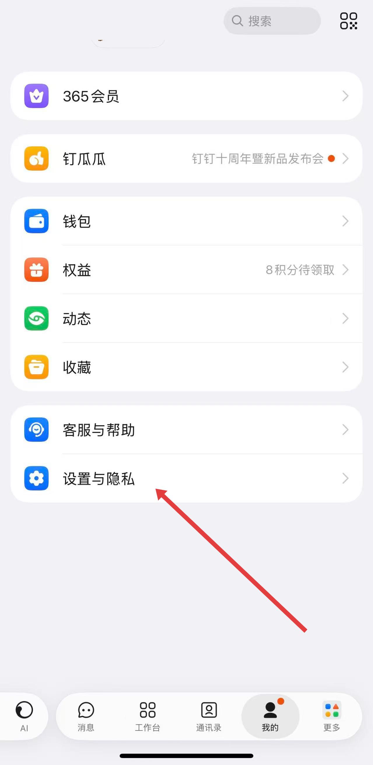 1、打開釘釘,點擊底部導(dǎo)航欄中的我的,進(jìn)入個人頁面,點擊設(shè)置與隱私。