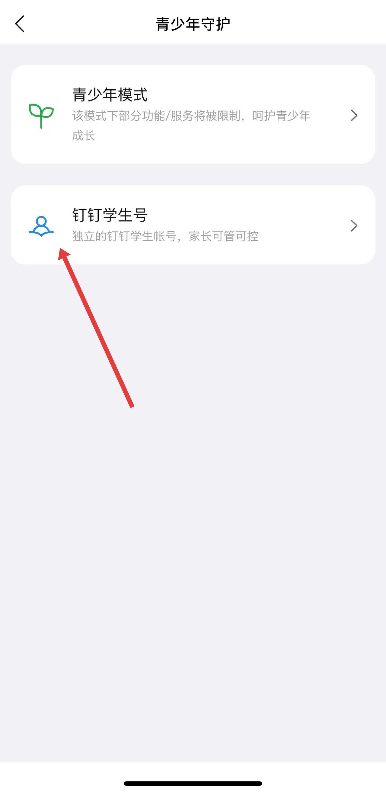 3、進(jìn)入青少年守護(hù)頁面后,點擊釘釘學(xué)生號選項。