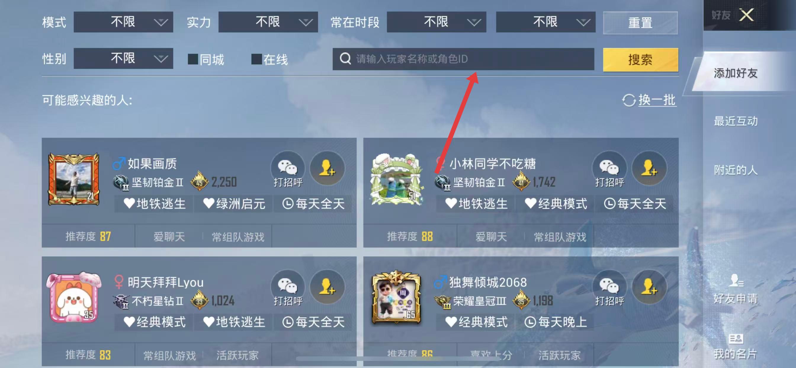 3、輸入想要添加的玩家名稱或角色ID,即可加好友。