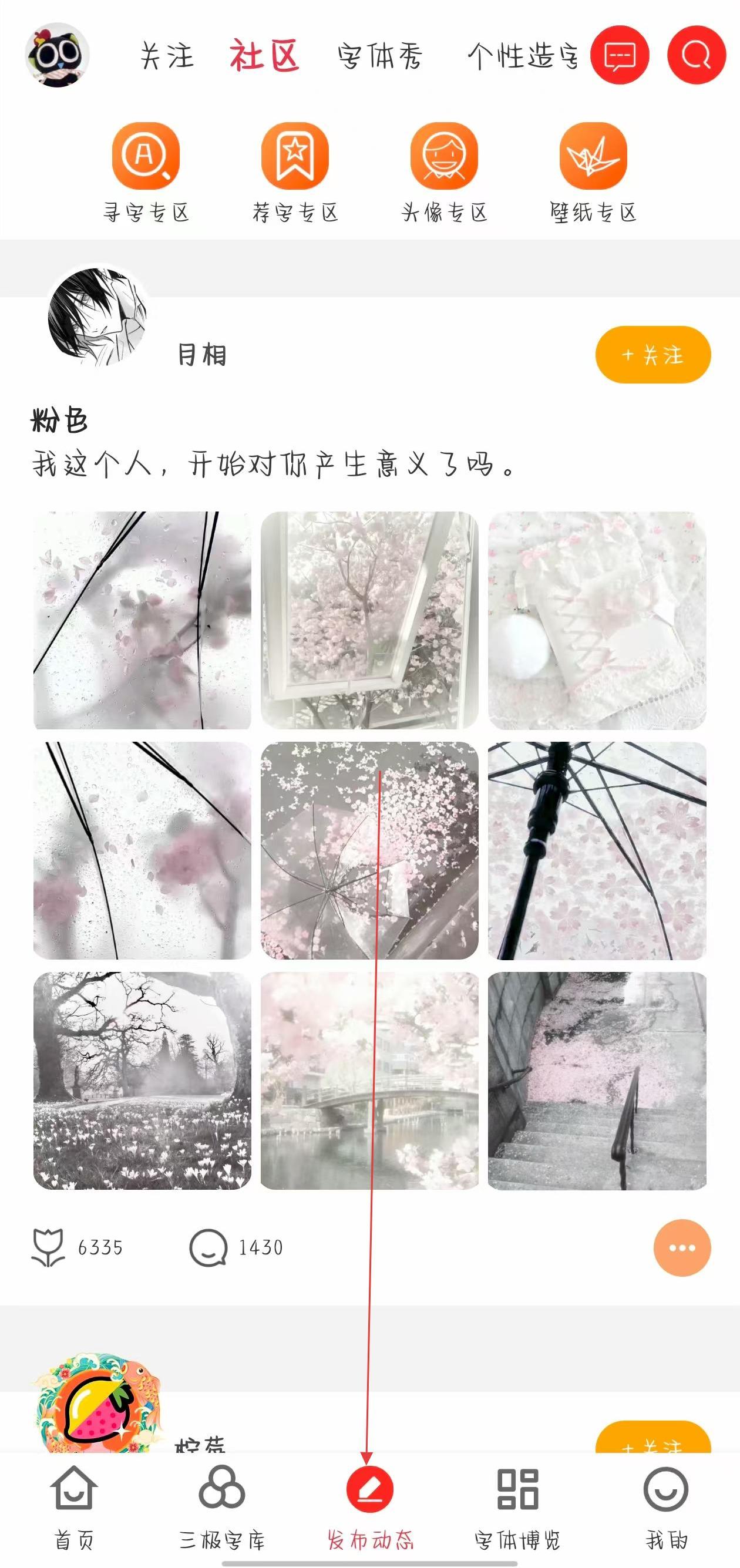 1、打開字體美化大師應(yīng)用,進入底部導(dǎo)航欄中的社區(qū)頁面,點擊底部中間的發(fā)布動態(tài)按鈕。
