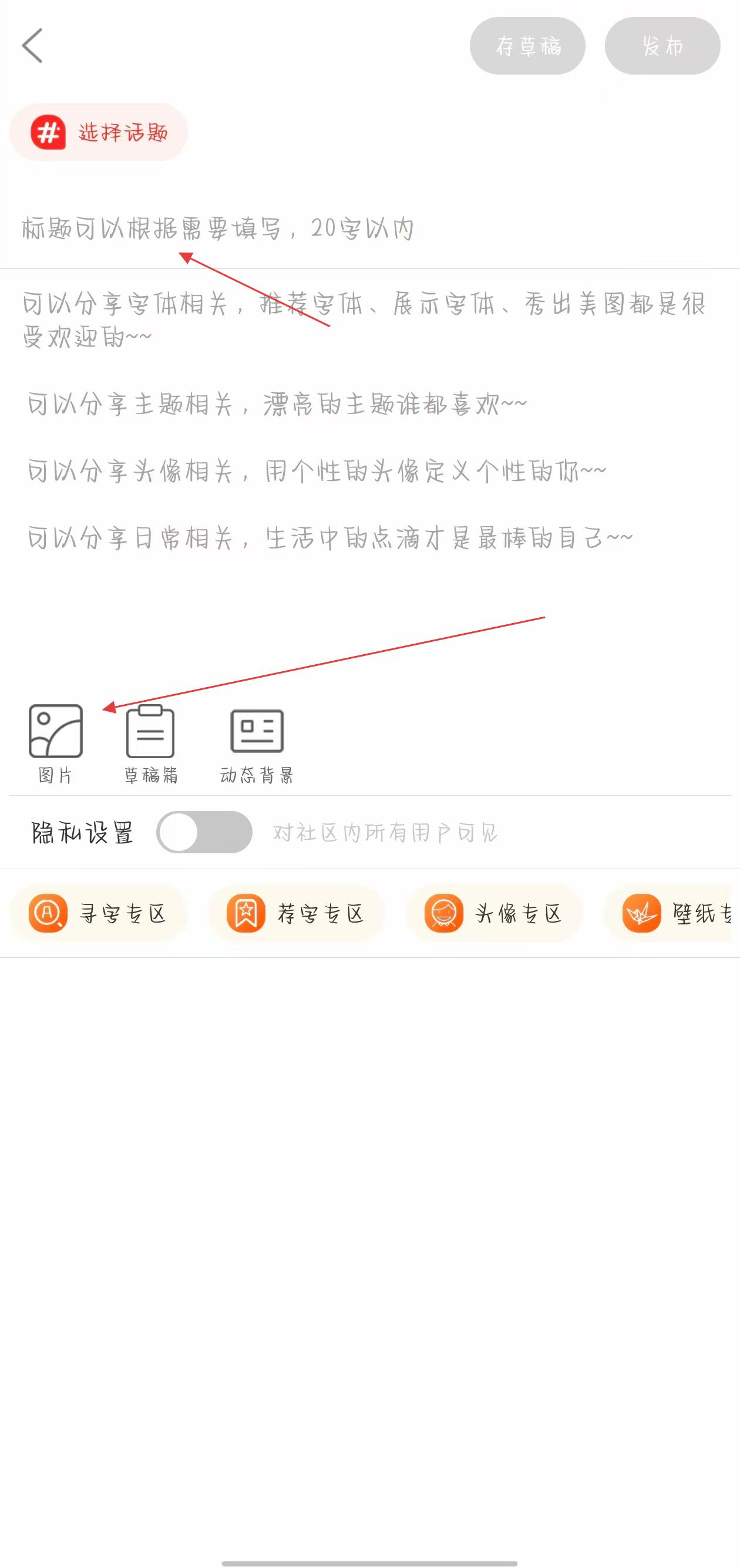 2、進入動態(tài)編輯頁面,可在標題欄輸入不超過20字的標題,在內(nèi)容編輯區(qū)域輸入想要分享的文字內(nèi)容,還能點擊圖片按鈕添加相關(guān)圖片。