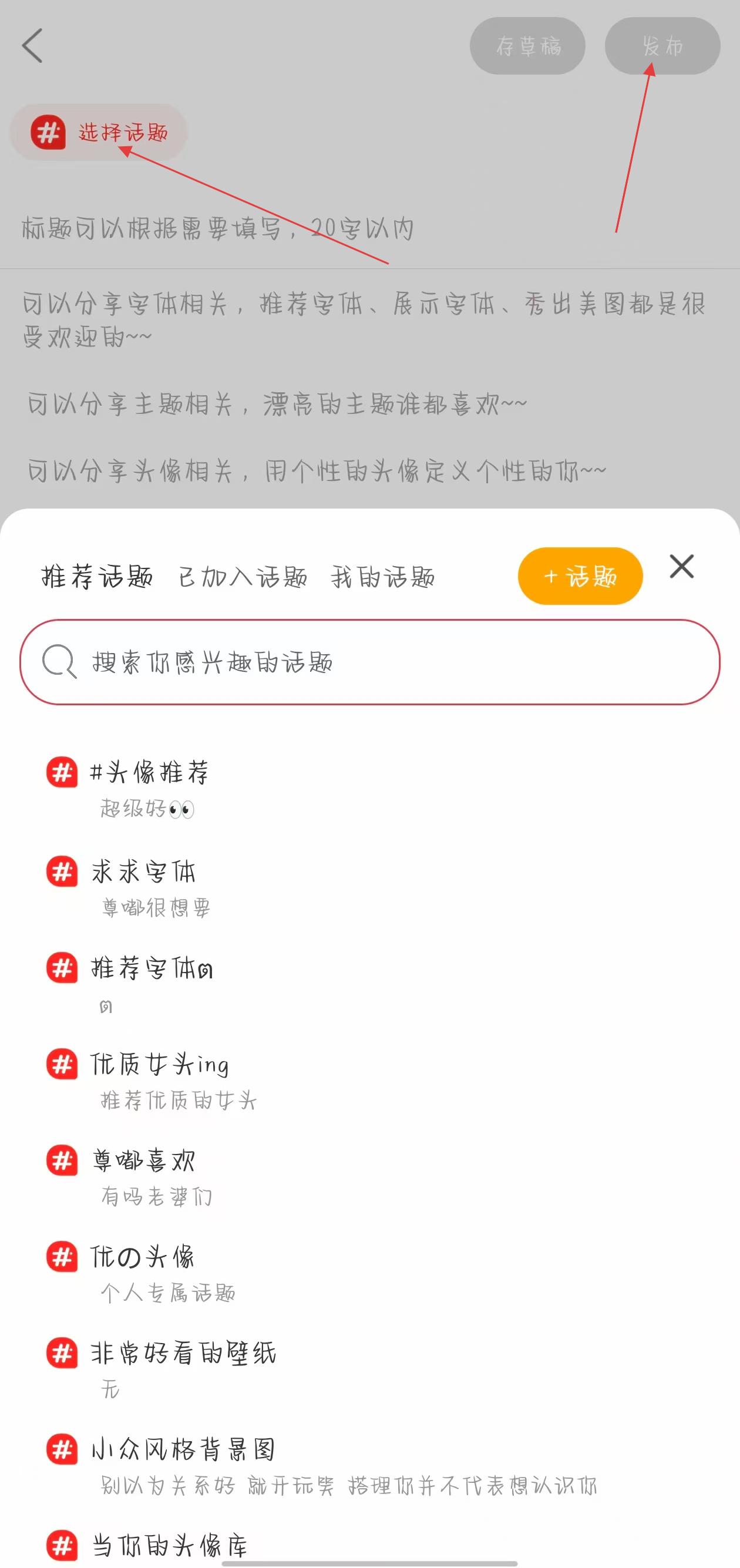 3、點擊#選擇話題,在彈出的話題列表中選擇合適話題,完善隱私設(shè)置等信息后,點擊右上角的發(fā)布按鈕,即可成功發(fā)布動態(tài)。