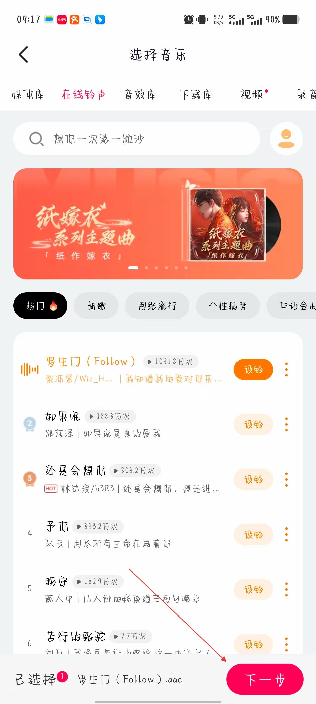 2、在選擇音樂界面,挑選需要進行剪輯的音頻,挑選完成后點擊界面下方的下一步。