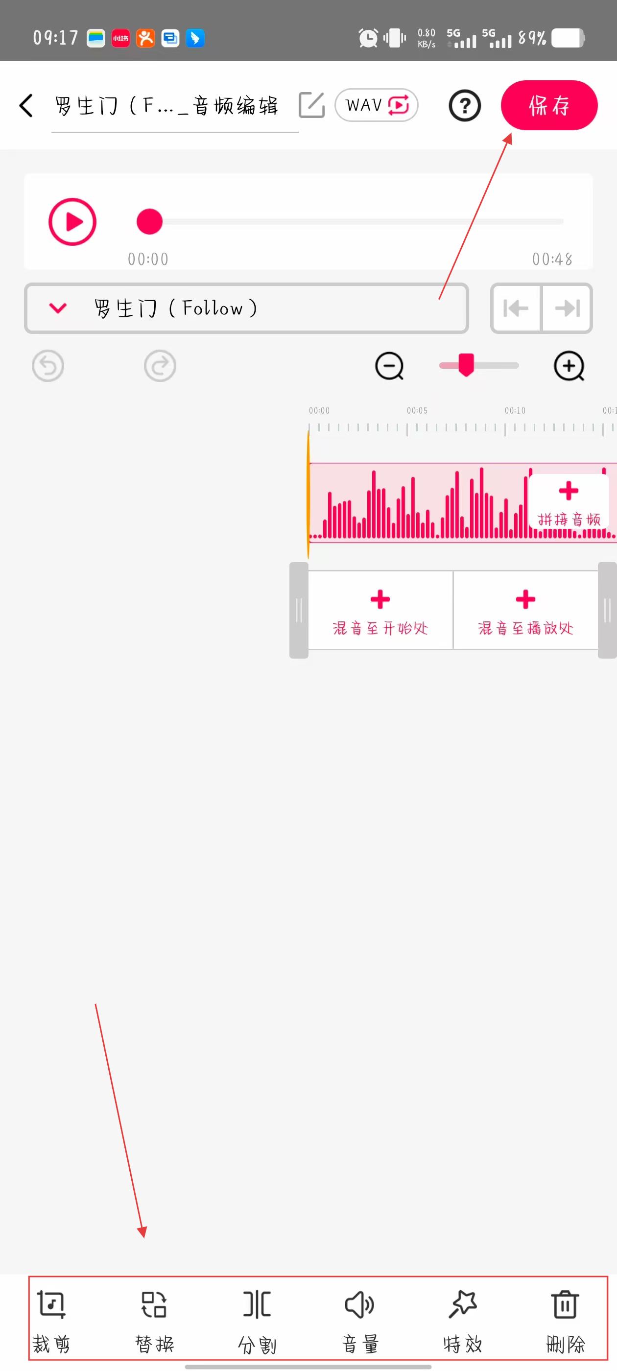 3、進入音頻編輯界面后,利用底部功能進行調(diào)整,完成音頻剪輯后,點擊界面右上角的保存按鈕。