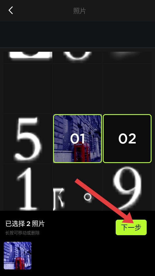 2、在選擇界面選取照片素材,點擊下一步,進入拼貼編輯界面。