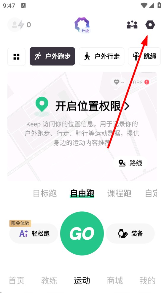 1、打開KeepAPP,點(diǎn)擊右上角設(shè)置圖標(biāo),進(jìn)入跑步設(shè)置界面。