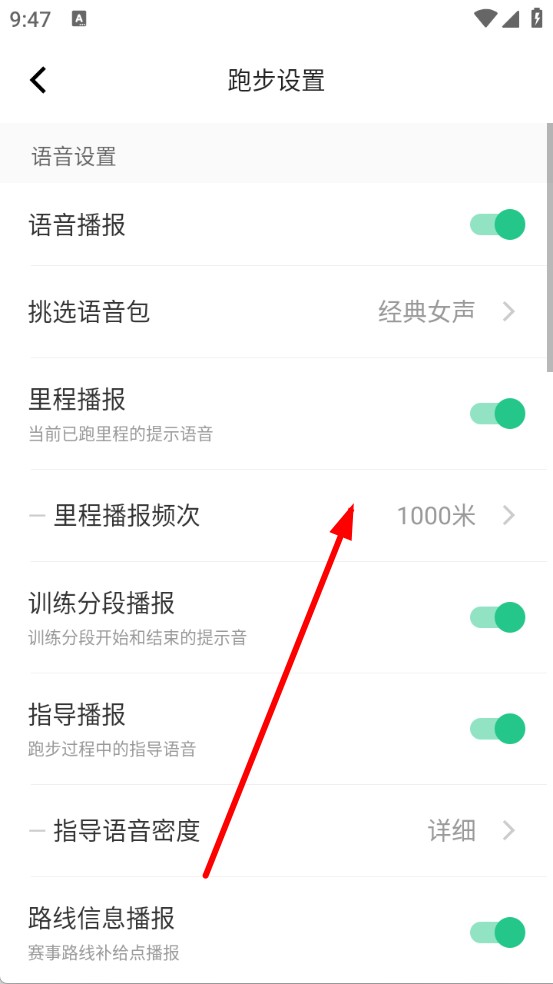 2、在跑步設(shè)置里,找到「里程播報(bào)頻次」選項(xiàng)并點(diǎn)擊。
