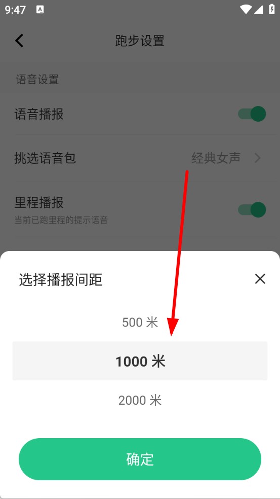 3、在彈出的選擇播報(bào)間距窗口,選500米、1000米等想要的頻率,點(diǎn)擊「確定」完成設(shè)置。