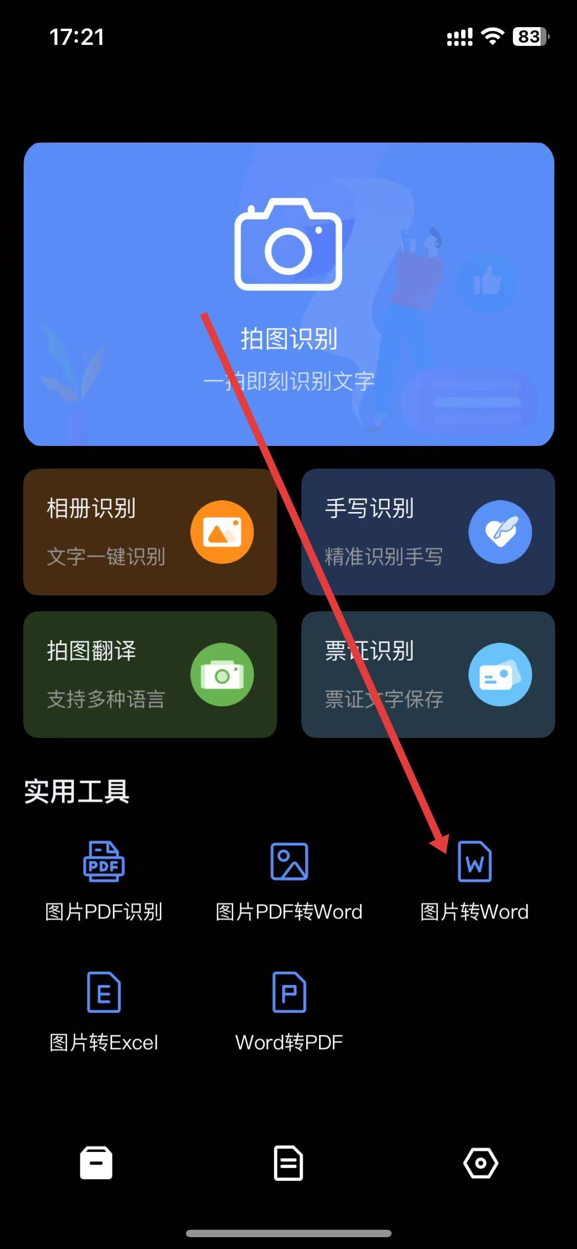 1、進入主界面,在實用工具板塊中,點擊圖片轉(zhuǎn)Word選項。