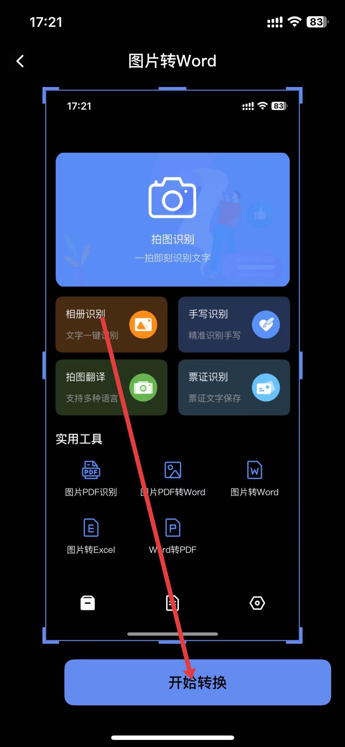 3、點擊下方的開始轉(zhuǎn)換按鈕,等待軟件識別圖片中的文字并進行格式轉(zhuǎn)換。