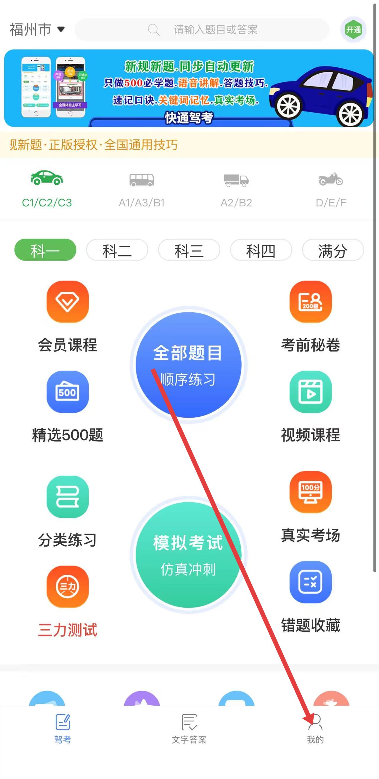 1、打開快通駕考APP,點(diǎn)擊底部導(dǎo)航欄中的我的,進(jìn)入用戶中心頁面。
