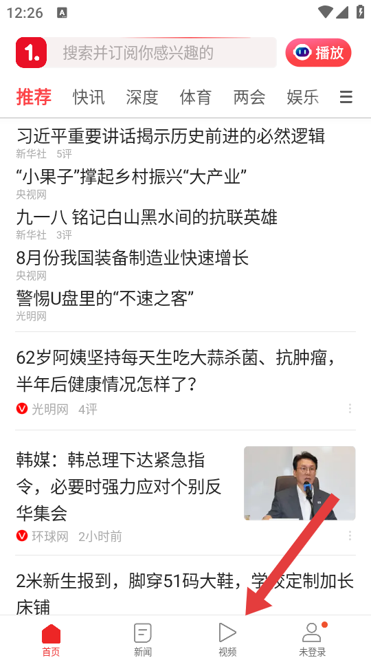 1、打開一點(diǎn)資訊APP,點(diǎn)擊底部的視頻,進(jìn)入視頻播放的界面。