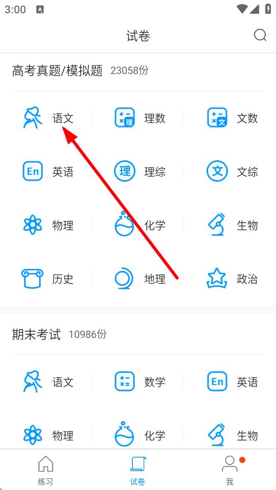 2、在試卷頁面中,選擇想要練習(xí)的科目,例如語文。