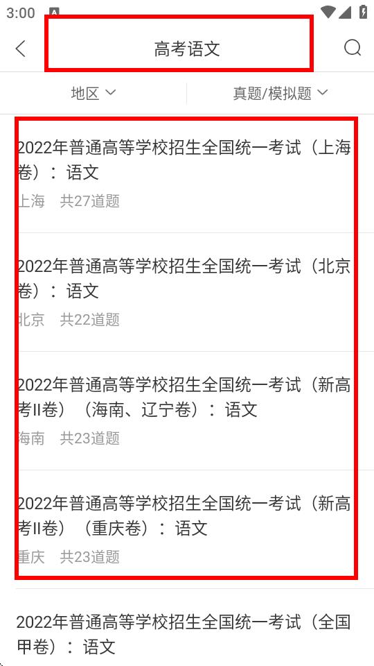 3、進入對應(yīng)科目頁面后,會看到不同年份、地區(qū)的試卷列表,選擇一份想做的試卷,點擊進入試卷詳情頁。