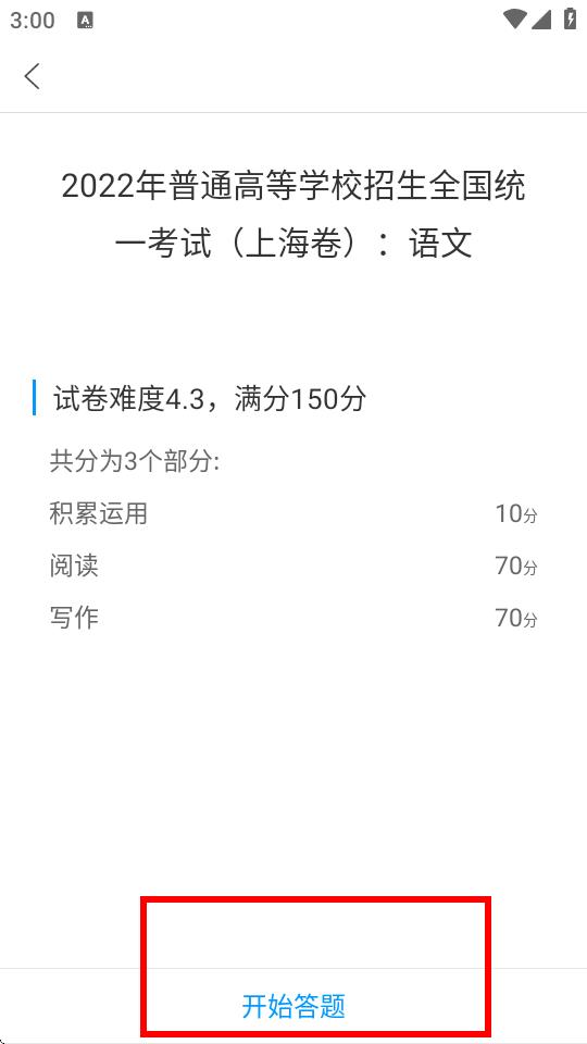 4、在試卷詳情頁中,查看試卷的難度、滿分、題型分布等信息,確認(rèn)后點擊開始答題按鈕,即可開始做題。