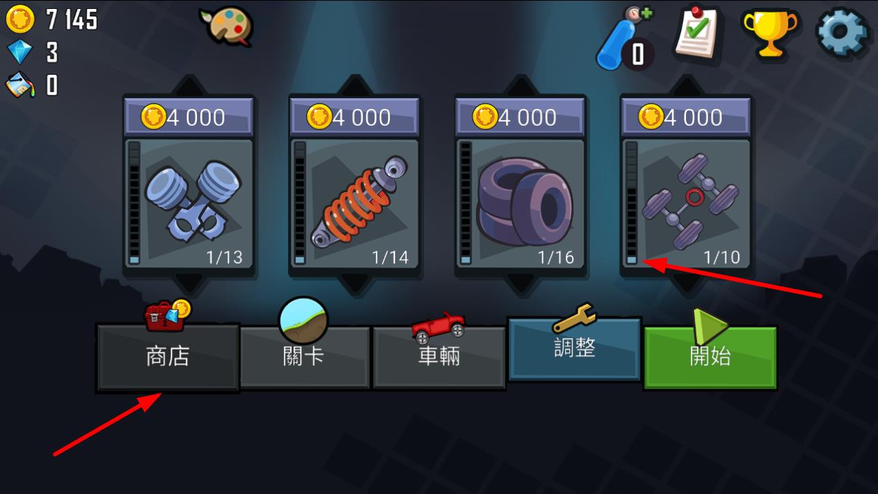 1、進(jìn)入游戲主界面,若想提升車(chē)輛性能,可以點(diǎn)擊商店,花費(fèi)金幣購(gòu)買(mǎi)如活塞、彈簧、輪胎等零件 ,為后續(xù)挑戰(zhàn)關(guān)卡做好準(zhǔn)備。